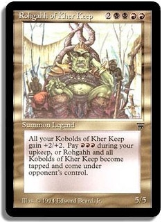 All your Kobolds of Kher Keep gain +2/+2. Pay <RRR> during your upkeep or Rohgahh and all Kobolds of Kher Keep become tapped and come under opponent's control.
