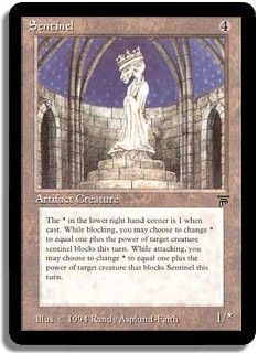 The * in the lower right hand corner is 1 when cast. While blocking, you may choose to change * to equal one plus the power of target creature sentinel blocks this turn. While attacking, you may choose to change * to equal one plus the power of target creature that blocks Sentinel this turn.
