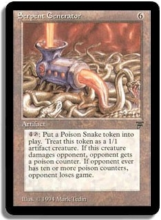 <4,T>: Put a Poison Snake token into play. Treat this token as a 1/1 artifact creature. If this creature damages opponent, opponent gets a poison counter. If opponent ever has ten or more poison counters, opponent loses game.