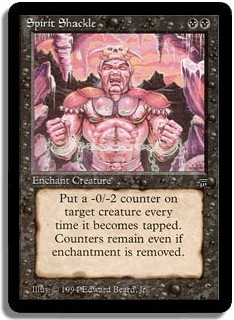 Put a -0/-2 counter on target creature every time it becomes tapped. These counters remain even if Spirit Shackle is removed.