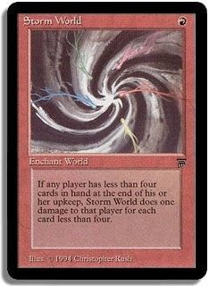 If any player has less than four cards in hand at the end of his or her upkeep, Storm World does one damage to that player for each card less than four.