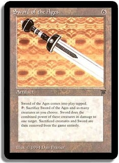 Sword of the Ages comes into play tapped. <T>: Sacrifice Sword of the Ages and as many creatures as you choose. Sword does the combined power of these creatures in damage to one target. Sacrificed creatures and Sword are then removed from the game entirely.
