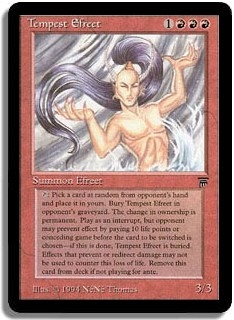 <T>: Choose a card at random from target opponent's hand and put it in yours. Bury Tempest Efreet in opponent's graveyard. The change in ownership is permanent. Play this ability as an interrupt. Before you choose the card to be switched, the opponent may prevent effect by paying 10 life or conceding game; if this is done, bury Tempest Efreet. Effects that prevent or redirect damage cannot be used to counter this loss of life. Remove Tempest Efreet from your deck before playing if not playing for ante.