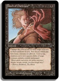 Changes the color of one or more target creatures to black until end of turn. You choose which and how many creatures are affected. Cost to tap, maintain, or to use a special ability of target creatures remains entirely unchanged.