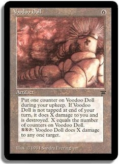 Put one counter on Voodoo Doll during your upkeep. If Voodoo Doll is not tapped at end of your turn, it does X damage to you and is destroyed. X equals the number of counters on Voodoo Doll. <XX,T>: Voodoo Doll does X damage to any one target.