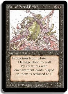 Protection from white. Damage done to wall by creatures with enchantment cards played on them is reduced to 0.