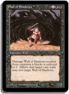 Damage Wall of Shadows receives from creatures it blocks is reduced to 0. Effects that target only walls may not target Wall of Shadows.