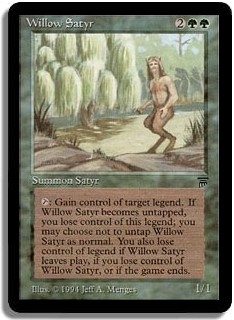 <T>: Gain control of target legend. If Willow Satyr becomes untapped, you lose control of this legend; you may choose not to untap Willow Satyr as normal. You also lose control of legend if Willow Satyr leaves play, if you lose control of Willow Satyr, or if the game ends.