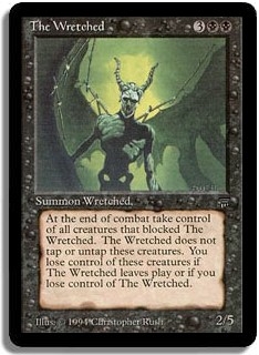 At the end of combat take control of all creatures that blocked The Wretched. The Wretched does not tap or untap these creatures. You lose control of these creatures if The Wretched leaves play or if you lose control of The Wretched.
