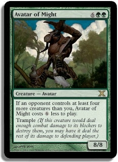 If an opponent controls at least four more creatures than you, Avatar of Might costs 6 less to play. Trample (If this creature would deal enough combat damage to its blockers to destroy them, you may have it deal the rest of its damage to defending player.)