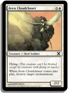 Flying (This creature can't be blocked except by creatures with flying or reach.) When Aven Cloudchaser comes into play, destroy target enchantment.