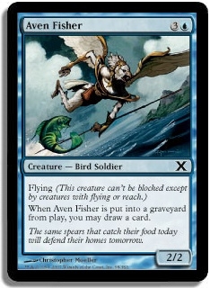 Flying (This creature can't be blocked except by creatures with flying or reach.) When Aven Fisher is put into a graveyard from play, you may draw a card.