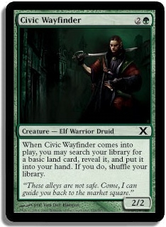 When Civic Wayfinder comes into play, you may search your library for a basic land card, reveal it, and put it into your hand. If you do, shuffle your library.