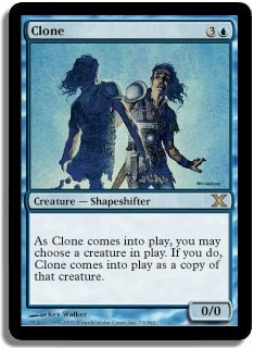 As Clone comes into play, you may choose a creature in play. If you do, Clone comes into play as a copy of that creature.