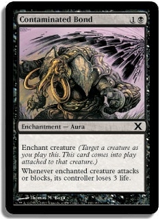 Enchant creature (Target a creature as you play this. This card comes into play attached to that creature.) Whenever enchanted creature attacks or blocks, its controller loses 3 life.