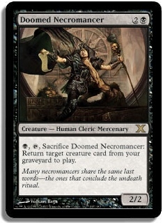 B, T, Sacrifice Doomed Necromancer: Return target creature card from your graveyard to play.