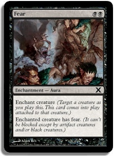 Enchant creature (Target a creature as you play this. This card comes into play attached to that creature.) Enchanted creature has fear. (It can't be blocked except by artifact creatures and/or black creatures.)