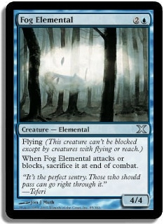 Flying (This creature can't be blocked except by creatures with flying or reach.) When Fog Elemental attacks or blocks, sacrifice it at end of combat.