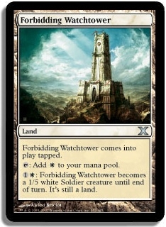 Forbidding Watchtower comes into play tapped. T Add W to your mana pool. 1W: Forbidding Watchtower becomes a 1/5 white Soldier creature until end of turn. It's still a land.