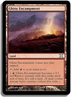 Ghitu Encampment comes into play tapped. T Add R to your mana pool. 1R: Ghitu Encampment becomes a 2/1 red Warrior creature with first strike until end of turn. It's still a land. (It deals combat damage before creatures without first strike.)