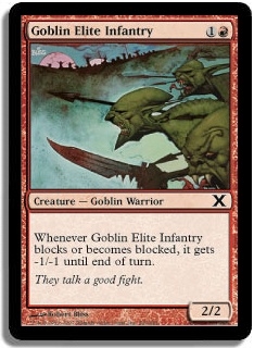 Whenever Goblin Elite Infantry blocks or becomes blocked, it gets -1/-1 until end of turn.