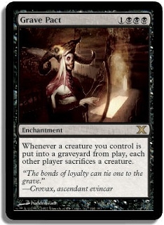 Whenever a creature you control is put into a graveyard from play, each other player sacrifices a creature.