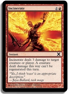 Incinerate deals 3 damage to target creature or player. A creature dealt damage this way can't be regenerated this turn.