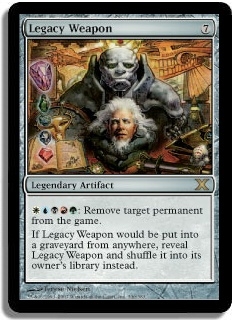 WUBRG: Remove target permanent from the game. If Legacy Weapon would be put into a graveyard from anywhere, reveal Legacy Weapon and shuffle it into its owner's library instead.