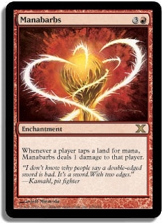 Whenever a player taps a land for mana, Manabarbs deals 1 damage to that player.