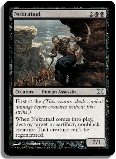First strike (This creature deals combat damage before creatures without first strike.) When Nekrataal comes into play, destroy target nonartifact, nonblack creature. That creature can't be regenerated.