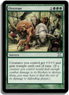 Creatures you control get +3/+3 and gain trample until end of turn. (If a creature you control would deal enough combat damage to its blockers to destroy them, you may have it deal the rest of its damage to defending player.)