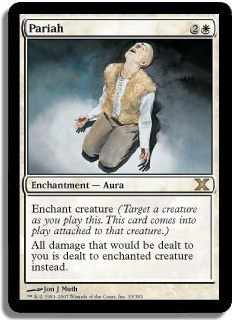 Enchant creature (Target a creature as you play this. This card comes into play attached to that creature.) All damage that would be dealt to you is dealt to enchanted creature instead.