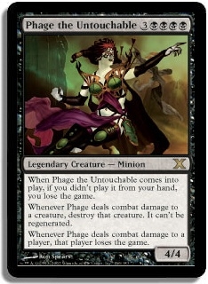 When Phage the Untouchable comes into play, if you didn't play it from your hand, you lose the game. Whenever Phage deals combat damage to a creature, destroy that creature. It can't be regenerated. Whenever Phage deals combat damage to a player, that player loses the game.