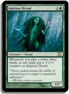 Whenever you play a white, blue, black, or red spell, put a +1/+1 counter on Quirion Dryad.