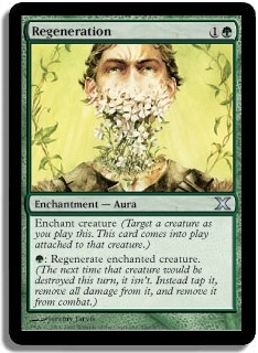 Enchant creature (Target a creature as you play this. This card comes into play attached to that creature.) G: Regenerate enchanted creature. (The next time that creature would be destroyed this turn, it isn't. Instead tap it, remove all damage from it, and remove it from combat.)