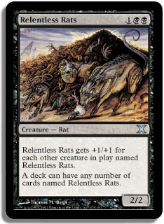 Relentless Rats gets +1/+1 for each other creature in play named Relentless Rats. A deck can have any number of cards named Relentless Rats.
