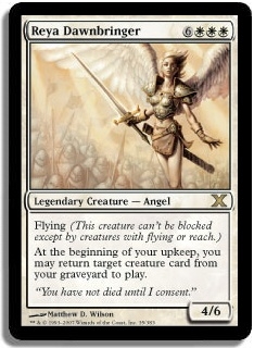 Flying (This creature can't be blocked except by creatures with flying or reach.) At the beginning of your upkeep, you may return target creature card from your graveyard to play.