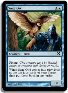 Flying (This creature can't be blocked except by creatures with flying or reach.) When Sage Owl comes into play, look at the top four cards of your library, then put them back in any order.