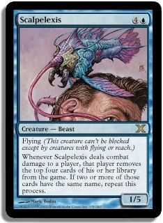 Flying (This creature can't be blocked except by creatures with flying or reach.) Whenever Scalpelexis deals combat damage to a player, that player removes the top four cards of his or her library from the game. If two or more of those cards have the same name, repeat this process.