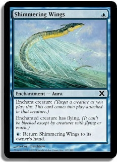 Enchant creature (Target a creature as you play this. This card comes into play attached to that creature.) Enchanted creature has flying. (It can't be blocked except by creatures with flying or reach.) U: Return Shimmering Wings to its owner's hand.