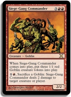 When Siege-Gang Commander comes into play, put three 1/1 red Goblin creature tokens into play. 1R, Sacrifice a Goblin: Siege-Gang Commander deals 2 damage to target creature or player.