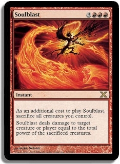 As an additional cost to play Soulblast, sacrifice all creatures you control. Soulblast deals damage to target creature or player equal to the total power of the sacrificed creatures.