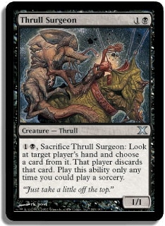 1B, Sacrifice Thrull Surgeon: Look at target player's hand and choose a card from it. That player discards that card. Play this ability only any time you could play a sorcery.