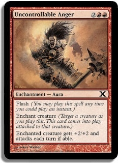 Flash (You may play this spell any time you could play an instant.) Enchant creature (Target a creature as you play this. This card comes into play attached to that creature.) Enchanted creature gets +2/+2 and attacks each turn if able.