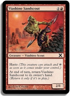 Haste (This creature can attack and T as soon as it comes under your control.) At end of turn, return Viashino Sandscout to its owner's hand. (Return it only if it's in play.)