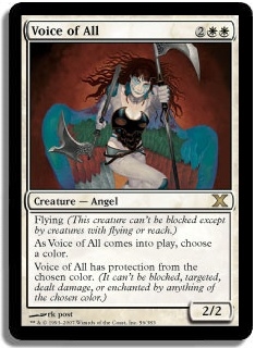 Flying (This creature can't be blocked except by creatures with flying or reach.) As Voice of All comes into play, choose a color. Voice of All has protection from the chosen color. (It can't be blocked, targeted, dealt damage, or enchanted by anything of the chosen color.)