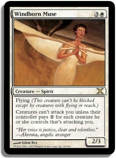 Flying (This creature can't be blocked except by creatures with flying or reach.) Creatures can't attack you unless their controller pays 2 for each creature he or she controls that's attacking you.