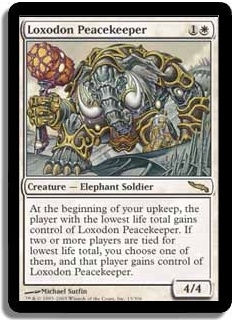 At the beginning of your upkeep, the player with the lowest life total gains control of Loxodon Peacekeeper. If two or more players are tied for lowest life total, you choose one of them, and that player gains control of Loxodon Peacekeeper.