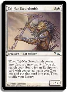When Taj-Nar Swordsmith comes into play, you may pay X. If you do, search your library for an Equipment card with converted mana cost X or less and put that card into play. Then shuffle your library.