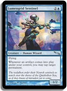 Flying Whenever an artifact comes into play under your control, you may tap target permanent.